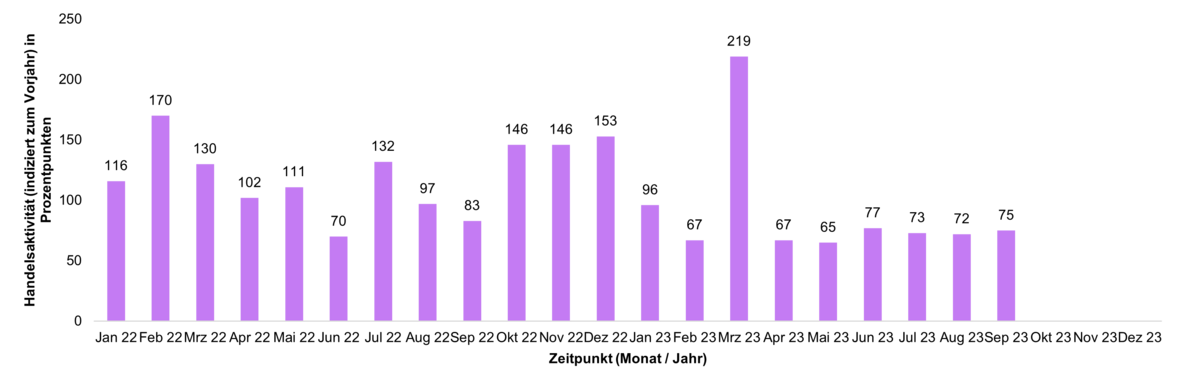 Die Handelsaktivität basiert auf dem Handelsvolumen und lässt unmittelbare Rückschlüsse auf den aktuellen Jahrestrend im Handel mit ETFs bei Kunden der FNZ Bank zu. Ein Wert von über 100 steht für eine überdurchschnittliche Handelsaktivität der Kunden im Vergleich zum mittleren monatlichen Handelsvolumen des Vorjahres; ein Stand unter 100 zeigt eine unterdurchschnittliche Handelsaktivität an.